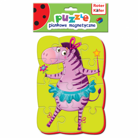 Śliczny obrazek magnetyczny przedstawiający zebrę czarodziejkę pomoże maluchowi nauczyć się koncentrować uwagę, ćwiczy drobną motorykę, uczy cierpliwości. To właśnie puzzle są pierwszą zabawką dzieci, dlatego powinny być wygodne w układaniu i miłe w dotyku. Puzzle magnetyczne Roter Käfer są zrobione ze spienionego materiału, co powoduje, iż są one lekkie i miękkie. Puzzle składają się z 12 części. Dla ułatwienia na spodzie opakowania znajduje się obrazek przedstawiający puzzle po ułożeniu.