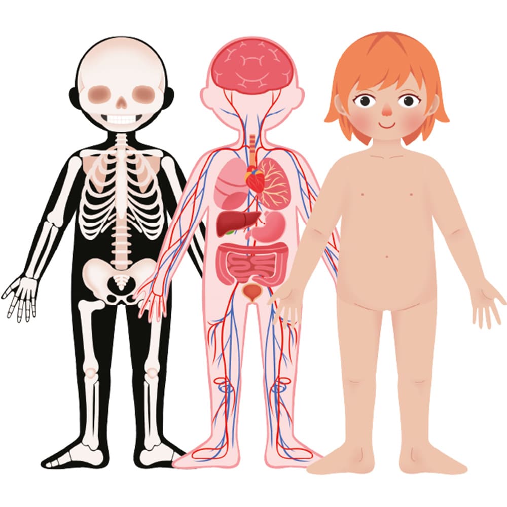 W zestawie 6 obrazków odwzorowujących kolejno: ciało, szkielet, mięśnie układ nerwowy, organy, układ krwionośny