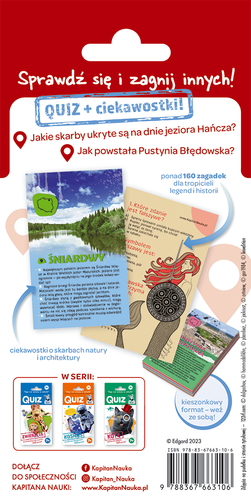 Prawdziwe wyzwanie dla podróżników oraz tropicieli legend i historii. W tej książeczce znajdziecie informacje o przełomowych wydarzeniach i postaciach, które zmieniły bieg polskiej historii, mniej znane fakty o znanych miejscach, a także mnóstwo ciekawostek o skarbach natury i architektury. A do tego ponad 160 pytań quizowych z odpowiedziami, dzięki którym można sprawdzić swoją wiedzę i zagiąć innych. Wybierzcie się w podróż po Polsce i dowiedzcie się... gdzie można spróbować prawdziwej brei, czyli zupy z zacierkami, jak, według legendy, powstała Pustynia Błędowska, jakie skarby ukryte są na dnie jeziora Hańcza, co oznacza słowo tablet w gwarze góralskiej.