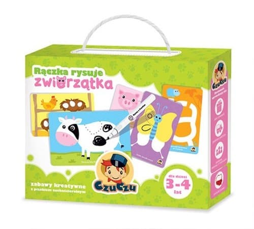 Krówce dorysujcie łatki, a wesołym stonkom paski! A może na odwrót? Dzięki magicznemu zestawowi wszystko jest możliwe i zależy wyłącznie od Waszej wyobraźni! W czarodziejskiej walizeczce znajdziecie 64 ilustracje na 32 kartach, pisak suchościeralny i ściereczkę. Zabawa ze zwierzątkami to rozwijanie grafomotoryki, kreatywności i logicznego myślenia.
