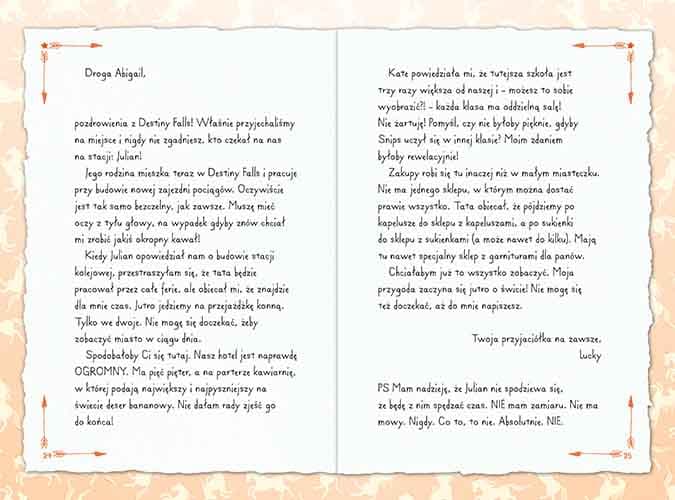W Miradero rozpoczynają się wiosenne ferie. Pru zamierza spędzić je na rodzinnej farmie, Abigail – w wytwornym domu wujostwa, a Lucky w dużym mieście, do którego uda się z tatą i… swą nową mamą. Wkrótce okaże się, że tygodniowa rozłąka to tylko jedno z wyzwań, z którymi muszą zmierzyć się dziewczyny. Jaką niespodziankę szykuje dla Lucky pan Prescott? Czy Abigail zostanie damą, a Pru uda się samodzielnie zorganizować rodeo? Przeczytaj o nowych przygodach swych ulubionych bohaterek – opowieść, którą znajdziesz w tej książce, wykracza poza fabułę serialu Mustang: Duch Wolności!