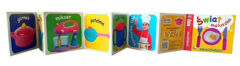 Książeczka HARMONIJKA dla MALUSZKÓW. Prezentuje kolorowe ZDJĘCIA i PODPISY. Książka • Bawi i uczy • Wprowadza w świat kuchni i jedzenia • rozwija WYOBRAŹNIĘ Świat maluszka Seria kartonowych książeczek dla najmłodszych. Bawi i uczy. Precyzyjnie dobrane ilustracje sprawią, że pierwsze spotkania dziecka z książką będą wspaniałą przygodą. Książeczka do składania typu harmonijka została wykonana z trwałego kartonu, dzięki czemu posłuży na długo. 16 kolorowych ilustracji wprowadzi każdego maluszka w otaczający go świat.Szczegółowe informacje na temat książki Świat maluszka Smacznego