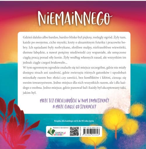 Gdzieś daleko albo bardzo, bardzo blisko był piękny, rozległy ogród. Żyły tam, każde po swojemu, ciche myszki, krety o aksamitnym futerku i pracowite bobry. Ich sąsiadami były rozbrykane, złośliwe małpy, niefrasobliwe wiewiórki, dumne łabędzie, a nawet potężny niedźwiedź czy wspaniałe, ale umęczone ciągłą pracą ponad siły konie. Żyły według własnych zasad, ale wszystkim im jednak ciągle czegoś brakowało... W tym ogromnym ogrodzie znalazło się też miejsce szczególne, gdzie nie miały dostępu strach ani zazdrość, gdzie zwierzęta różnych gatunków i upodobań mieszkały razem bez złości czy zawiści, bez konfliktów i kłótni, ciesząc się swoim towarzystwem. Jedno miejsce dla nich wszystkich razem, ale i dla każdego z osobna. Jedno miejsce, gdzie panował ład i każdy był akceptowany taki, jakim był. Może też chcielibyście w nim zamieszkać? A może ciągle go szukacie?