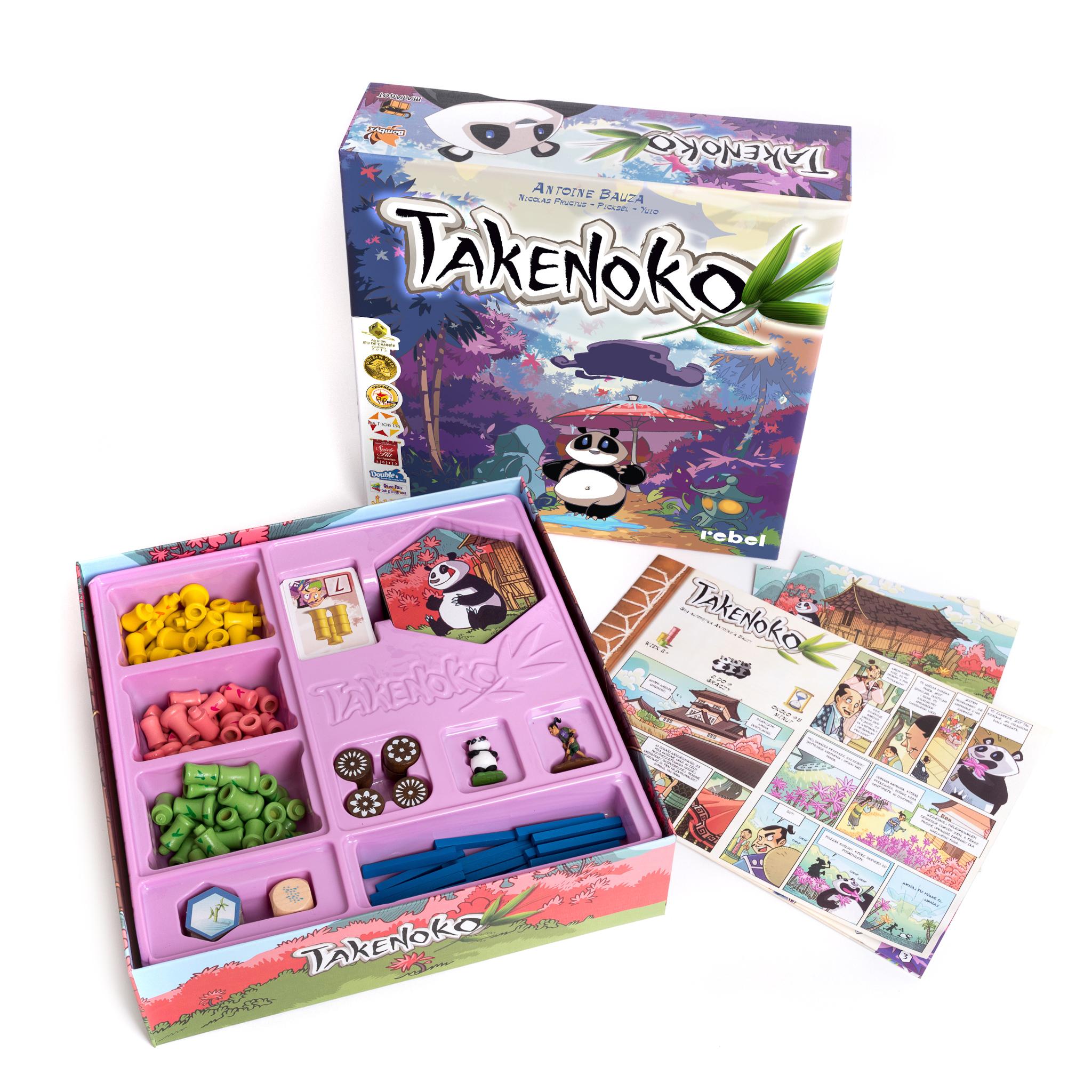 Po długiej serii sporów, relacje dyplomatyczne pomiędzy Japonią a Chinami w końcu się poprawiły. Aby odpowiednio uczcić tę zgodę chiński cesarz ofiarował japońskiemu władcy święte zwierzę, dużego misia pandę, symbol pokoju. Japoński cesarz powierzył ludziom ze swojego dworu (graczom) trudne zadanie zadbania o zwierzaka i przygotowanie dla niego ogrodu bambusowego. Gracze będą pielęgnować pola uprawne, nawadniać je i uprawiać na nich jeden z trzech rodzajów bambusa (zielony, żółty i różowy) przy pomocy cesarskiego ogrodnika. Swą rolę odegra także pogoda, od słonecznych dni, po pory monsunowe. Będą musieli także znosić wilczy apetyt pandy, łasej na soczyste pędy bambusa… Gracz któremu uda się zdobyć najwięcej punktów poprzez odpowiednią uprawę bambusa i karmienie pandy wygra grę. Takenoko jest niebanalną grą o stosunkowo prostych zasadach, w którą można grać w dowolnym gronie. Tematyka poruszona w grze oraz pierwszorzędne wykonanie elementów sprawiają, że obcowanie z tą pozycją jest niezwykle miłe i przyjazne da oka. W grę można grać już z dziećmi w wieku 8 lat, ale z doświadczenia wiemy, że przy pomocy rodziców świetnie radzą sobie z nią także 6 latki. Liczba graczy: 2 - 4 osoby Wiek: od 8 lat Czas gry: ok. 45 minut Zawartość pudełka: 28 płytek pól uprawnych 36 zielonych pędów 30 żółtych pędów 24 różowe pędy 20 kanałów nawadniania 9 usprawnień 46 kart celu 4 plansze graczy 8 żetonów akcji kość pogody figurka pandy figurka ogrodnika instrukcja
