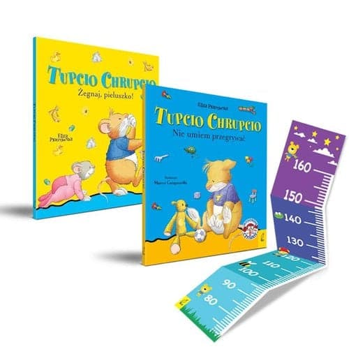 Pakiet 2 książek, których bohaterem jest Tupcio Chrupcio i miarka w prezencie! Przedszkolak na medal Tupcio Chrupcio jest już dużą myszką i zwykle niczego się nie boi, tylko… nie lubi chodzić do lekarza. Tym razem spadł z drabinki i musi pojechać na pogotowie, gdzie zajmą się nim troskliwie pielęgniarka i pan doktor. Czy Tupcio Chrupcio zrozumie, że lekarza nie trzeba się bać? Posłuchajcie! Nie chcę się myć! Tupcio Chrupcio jest już dużą myszką, ale boi się wejść do wanny i nie chce się wykąpać. Nie wie, że w kąpieli może być przyjemnie i wesoło. Czy rodzice przekonają Tupcia do mycia? Posłuchajcie!