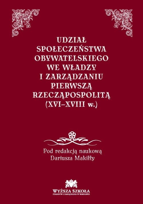 Prace prezentowane w niniejszym zbiorze stanowią rozszerzone i wzbogacone wydanie referatów wygłoszonych podczas sympozjum, które odbyło się 13 listopada 2015 r. na Wydziale Prawa i Administracji Wyższej Szkoły Finansów i Zarządzania w Warszawie. W swej treści nawiązują do zasadniczej idei kolokwium, ukazując różne aspekty – zarówno polityczne, jak i społeczne – udziału społeczeństwa obywatelskiego we władzy i zarządzaniu Pierwszą Rzecząpospolitą w XVI–XVIII wieku. Poruszona problematyka ukazuje różnorodność, a także stopień zaawansowania rozwoju form i doświadczeń obywatelskiego funkcjonowania dawnej Rzeczypospolitej.