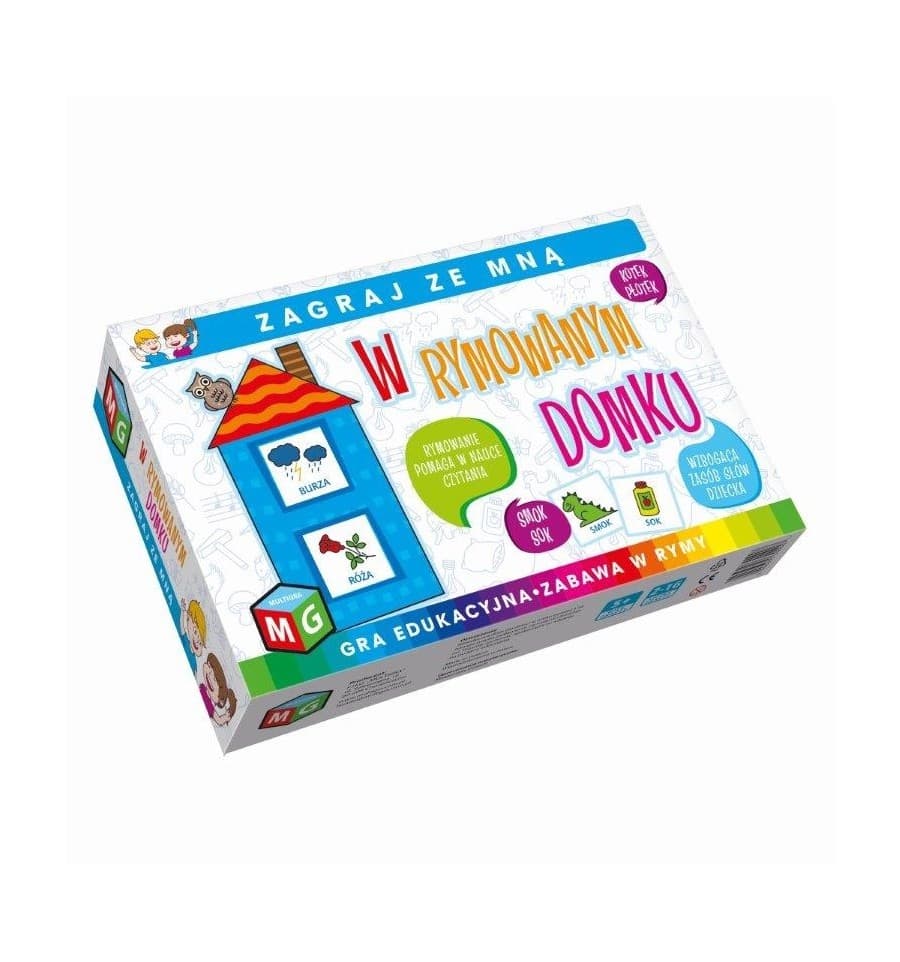 Gra dydaktyczna, która w przyjemny i intrygujący dla dziecka sposób pomaga kształtować umiejętność tworzenia rymów. Miłe dla oka rysunki oraz kolorystyka, skupiają uwagę graczy na zabawie w poszukiwanie rymujących się par wyrazów. Gra wzbogaca słownik dziecka, rozwija umiejętność czytania, umozliwia rozpoznawanie i identyfikowanie kolorów, a przy tym uczy cierpliwości oraz konieczności respektowania ustalonych reguł. Celem gry jest prawidłowe ustalenie wszystkich rymujących się ze sobą par wyrazów. Zawartość pudełka: plansze domki -8 szt, kolorowe suwaki- 16 szt, instrukcja. Wiek graczy: 5+ Liczba graczy: 2-16
