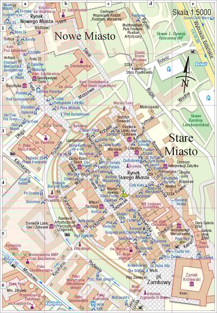 Plan centrum Warszawy, w wersji wodoodpornej (foliowanej), w dokładnej skali 1:7 000 ze szczegółowym rysunkiem ulic i budynków. Opracowanie obejmuje zasięgiem Stare i Nowe Miasto, Śródmieścia Północne i Południowe, Park Łazienkowski, Powiśle i fragment Starej Pragi.