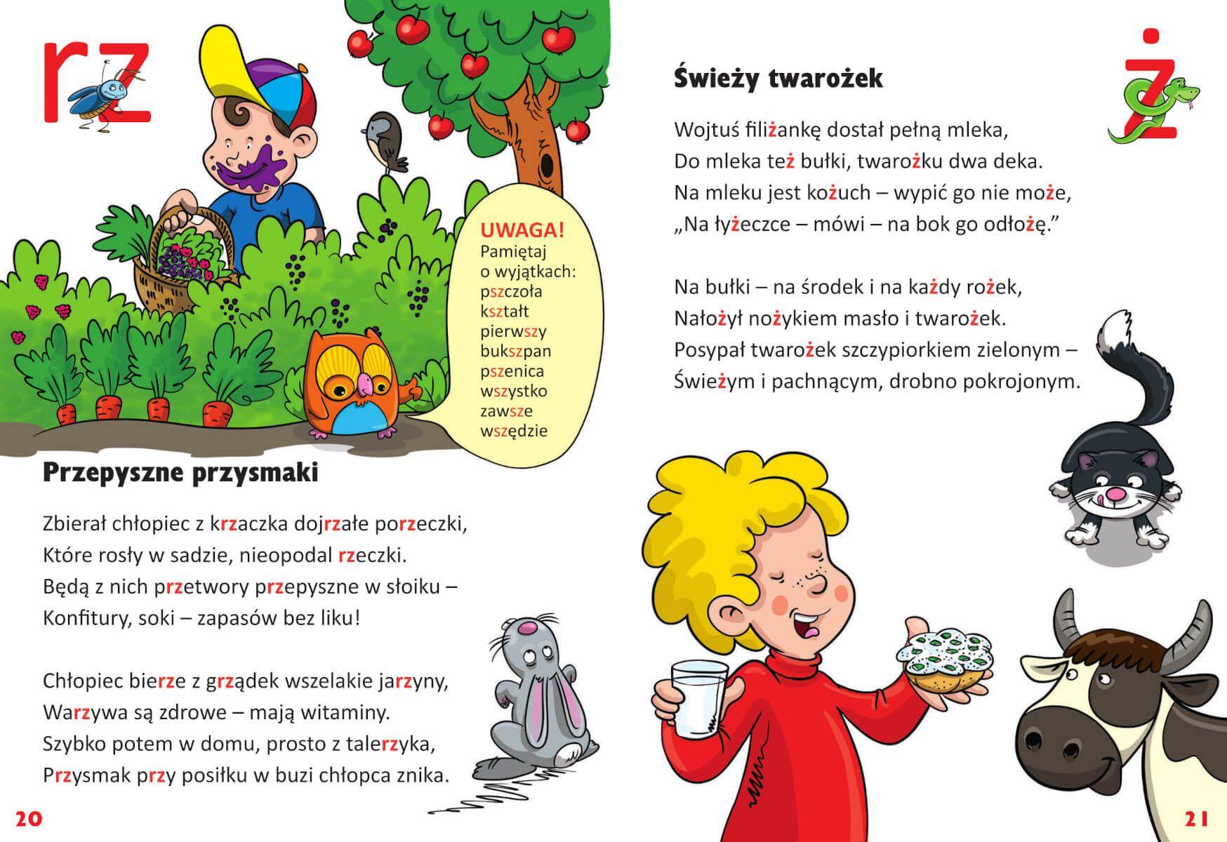 Poczytaj o Krzysiu i Katarzynie, którzy sprzątają odkurzaczem, o żmii, która niczym wstążka wije się na ścieżce, oraz o tym, że ropucha chwilę chce być sucha. Z zabawnymi wierszykami ortografia stanie się po prostu zabawą!