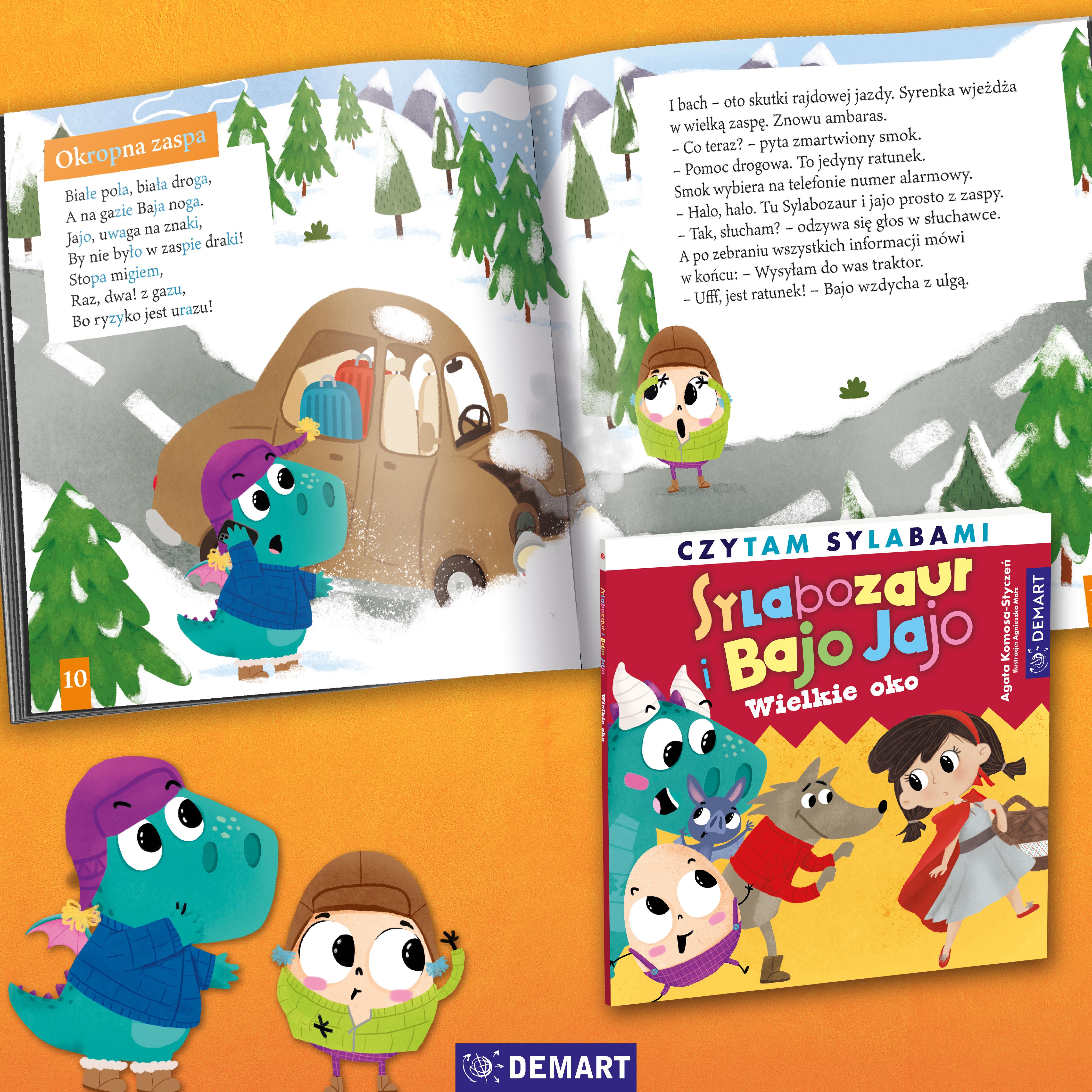 Poznaj Sylabozaura – przyjaznego smokozaura, który przed snem zaczytuje się w książkach, ale… rano nic z nich nie pamięta! Zamiast opowieści zostają mu tylko czkawka słów i pojedynczych sylab, wzdęty brzuch i płonące gardło! Na szczęście może liczyć na swojego zabawnego towarzysza Bajo Jajo. Razem spróbują rozwikłać zagadkę, o jaki tekst literacki chodzi, zanim kolejne słowa wyparują bez śladu. Tym razem trop prowadzi do jednej z najpopularniejszych baśni, ale zanim bohaterowie rozwikłają zagadkę, czeka ich prawdziwa wyprawa pełna niespodzianek.