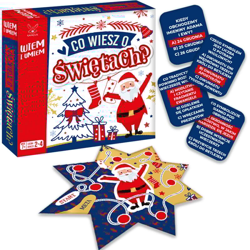 Kiedy obchodzimy imieniny Adam i Ewy? Co symbolizuje sianko pod obrusem. Czego symbolem jest liczna 12 potraw wigilijnych? Wesoła i dynamiczna gra, w której uczestnicy odgadują wiele ciekawostek o świętach. Doskonała rywalizacja, odpowiadaj na pytania i przesuwaj pionek do przodu. Wygrywa gracz, który odpowie na więcej pytań!