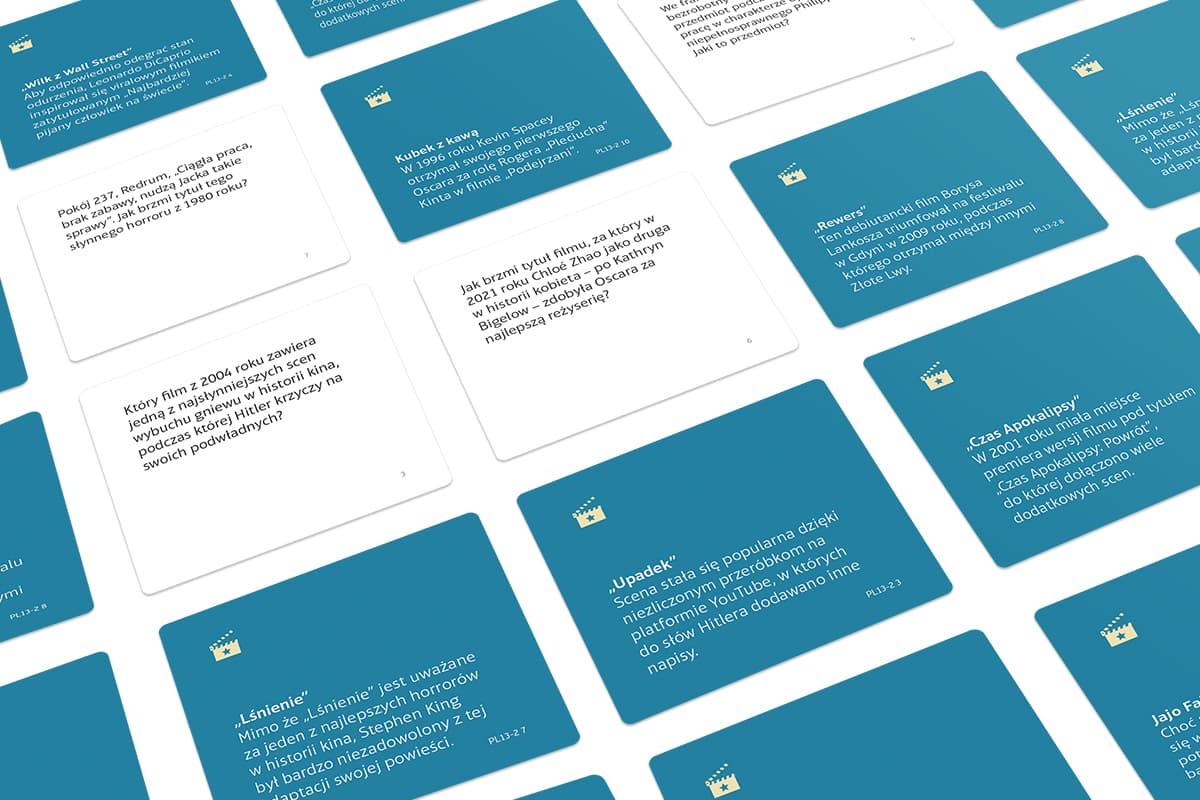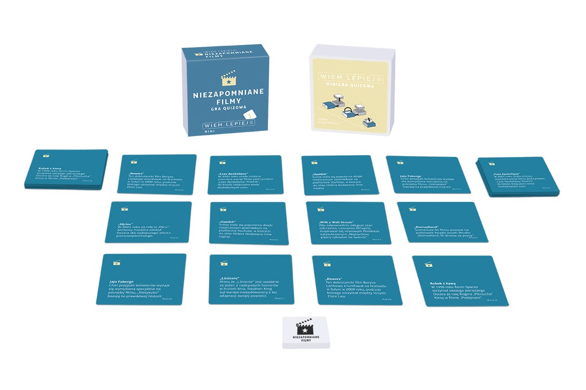 Mini gra quizowa i rozszerzenie do Wiem lepiej w jednym! Z jakim filmem kojarzy Ci się porwanie Pameli Anderson oraz niedźwiedź w furgonetce z lodami? Jaką przykrą niespodziankę znalazł w łóżku producent Jack Woltz, bohater „Ojca chrzestnego”? Rzuć znajomym wyzwanie dotyczące wiedzy o kultowych filmach i zabłyśnij ich znajomością, dzięki specjalnej mini grze z serii Wiem lepiej! Wiem lepiej: Niezapomniane filmy to 60 pytań, które zabiorą Was w podróż po kinematografii: od tytułów, poprzez ikoniczne sceny aż do popularnych cytatów. Możecie odpowiadać na pytania tylko z tej kategorii, ale też wykorzystać zestaw jako dodatek do taktycznej gry quizowej Wiem lepiej. W pudełku znajdziesz płytkę kategorii, którą możesz dołączyć do puli podstawowych lub zastąpić nią jedną z nich. Wiek graczy: 16+ Liczba graczy: 2+ Czas rozgrywki: 20 minut