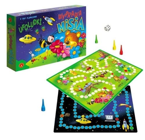 "Ufoludki" to gra w której gracze są uczestnikami kosmicznej wyprawy. Jej celem jest spotkanie z przybyszami z innej planety. Każdy uczestnik wyprawy musi dotrzeć na miejsce spotkania, a następnie szczęśliwie powrócić na Ziemię. Zwycięzcą w grze zostanie gracz, który dokona tego pierwszy. W grze "Wyprawa misia", głodny miś wyrusza na poszukiwanie miodu. Zdobycie upragnionego smakołyku nie jest jednak proste. Podczas wędrówki czekają na misia różne przygody, które mogą go do celu zbliżyć lub oddalić. Ten gracz, który jako pierwszy dotrze do miodu wygrywa. Zawartość pudełka: plansza, 4 pionki, kostka do gry, instrukcja. Wiek graczy: 5+ Liczba graczy 2-4
