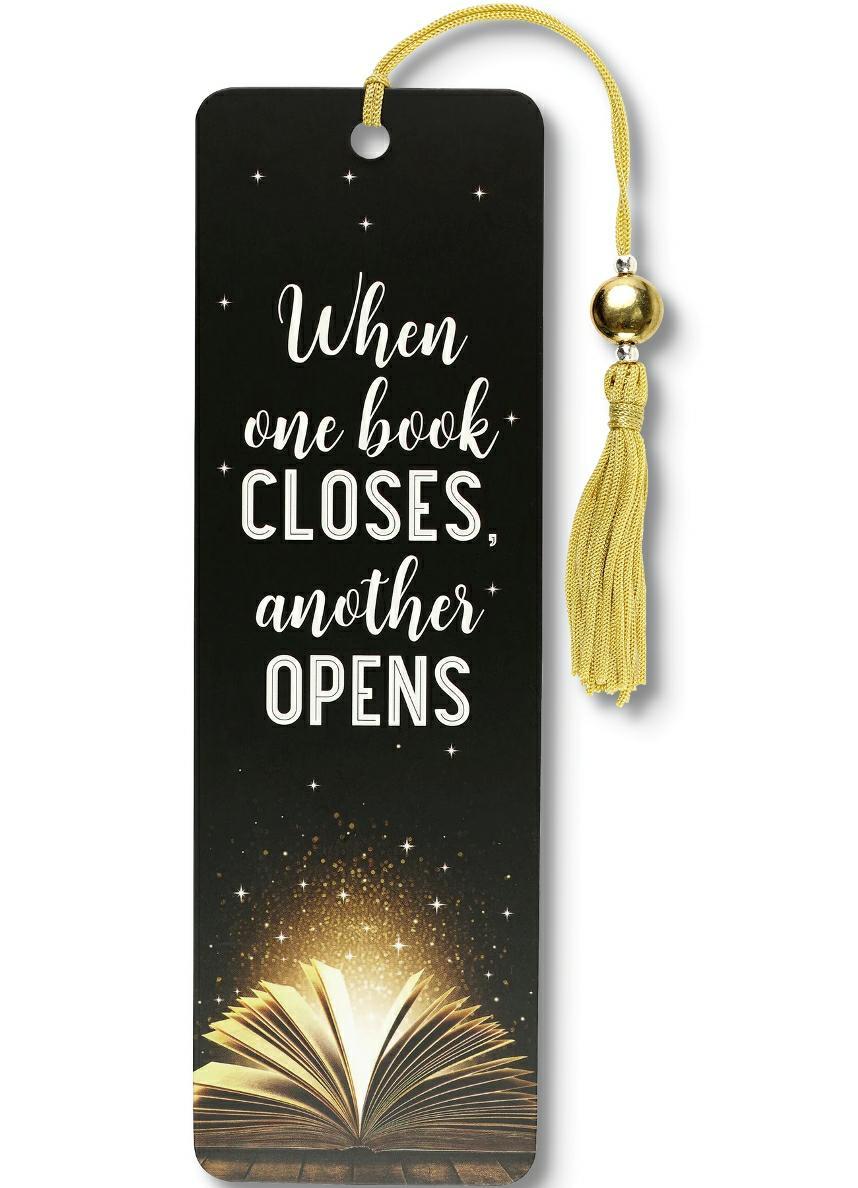 Zakładka do książki firmy Peter Pauper Press - Następna książka (When One Book Closes). "Kiedy jedna książka się zamyka, inna się otwiera". Zakładka ma dopasowaną kolorystycznie wstążkę z frędzlem oraz koralik. Barwne, trwałe, zabawne lub motywujące nadruki sprawią, że czytanie będzie jeszcze ciekawsze. Każda zakładka jest drukowana na trwałym, powlekanym kartonie i pakowana w przezroczystą osłonkę. Uniwersalny wymiar 6,4 x 18,1 cm.