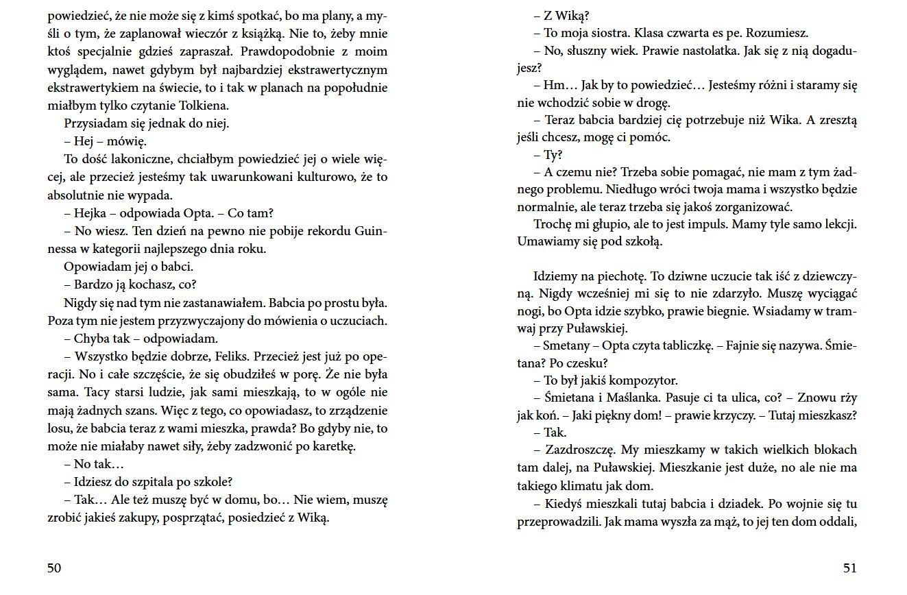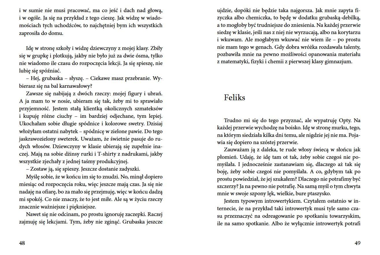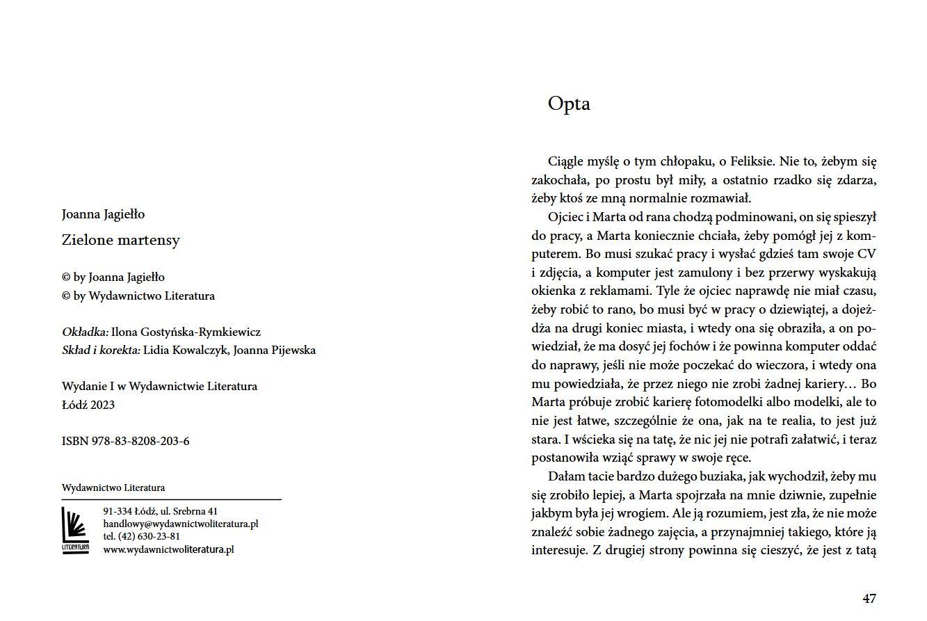 Otylia jest porywająca. Przyciąga każde spojrzenie Feliksa. Ubiera się ekstrawagancko, nie przejmuje się opinią innych, wciąż się uśmiecha. Nic dziwnego, że chłopak szybko się w niej zakochuje. Dopiero po pewnym czasie odkrywa jej sekret. I już wie, że są do siebie bardzo podobni. Feliks robi wszystko, by znaleźć czas dla Otylii, co nie jest łatwe, bo od wyjazdu mamy do pracy cały dom jest na jego głowie! Historia o miłości i samotności, która poruszy niejedno nastoletnie serce. Książka nagrodzona w IV edycji Konkursu Literackiego im. Astrid Lindgren, organizowanego przez Fundację ABCXXI – Cała Polska czyta dzieciom.Szczegółowe informacje na temat książki Zielone martensy