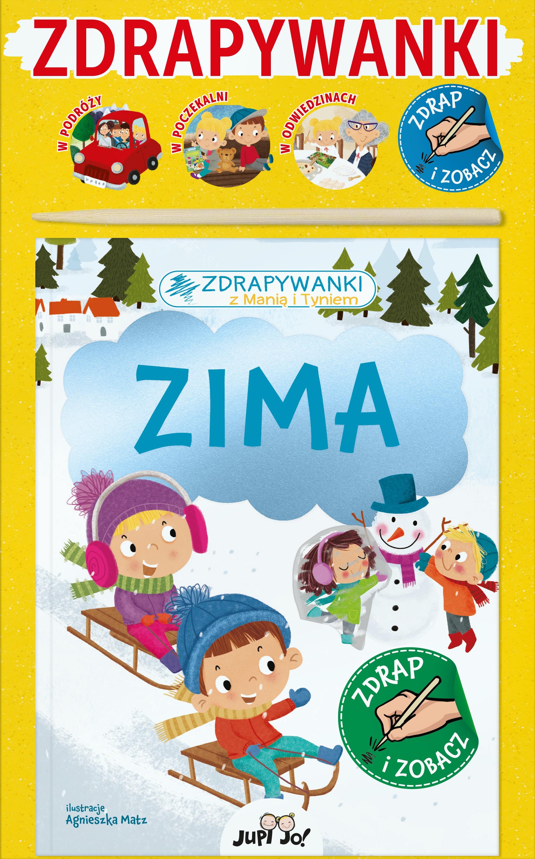Zdrapywanki z Manią i Tyniem. Zima ma poręczny format i poprzez zabawę wspiera rozwój manualny najmłodszych. Używając patyczka, dzieci zdrapują srebrną farbę i odkrywają całą ilustrację. To doskonały trening koncentracji. Dzieci, towarzysząc bohaterom, poznają zimę i jej oznaki. Będą bawić się na śniegu, piec pierniczki i pojadą w góry. Przy każdej ilustracji jest zamieszczone polecenie, które rozwija pamięć, spostrzegawczość i logiczne myślenie. Etykietki z wyrazami wspierają rozwój mowy i można je wykorzystać na wczesnym etapie czytania globalnego.